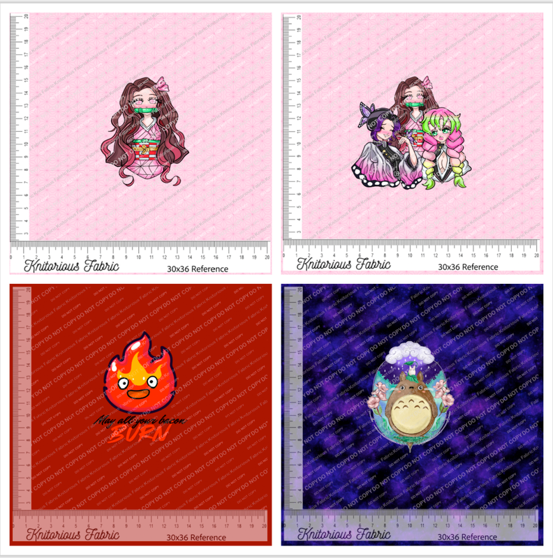 QTY of 1 = 1 yard or 1 panel For retail sometimes fabric might not be continuous. Could be 1,2,3,4, etc yard cuts. All sales are final for pre-orders once the round closes. No refunds will be given unless the round goes over the 16 week max turnaround time. It is your responsibility to check the FB wall or blog for round updates. Individual messages/emails and the like posted on the wall will not be answered continuously and you will only be referred to check yourself. Please follow washing instructions in 'terms' or in Facebook group doc under the files section or in the pinned post. Please also follow and special washing, drying, and use guidelines based on fabric types especially for delicate fabrics. Buyer negligence to not follow these instructions is not the seller's responsibility. Fabrics will be printed full width by fabric type, but please be aware imperfections are common along the sides of the selvage when doing small/custom orders and cutting off of selvage - this can result in a final width of 2-4" less useable fabric. Minor flaws such as a 1/2 inch - 2 inch difference or close to it in alignment during printing can also occur due to the nature of printing on stretch fabric, which can appear as a slight 'curve' to the printing of images on the fabric. Things such as a slight heathering/grainy look can occur on lighter colors (gray, light blue, etc). It is also possible to have a few tiny white specks here and there where lint comes off the fabric that had the ink on it. Minor flaws like this will not be discounted or refunded as this is the natural of digital printing. I do strive to bring only the very best quality though! Waterproof canvas has a very rough texture as stated in other areas, printing does not appear as 'crisp' and can also hinder some of the finer details and lines especially on dark background PLEASE NOTE: Different fabric types will vary in color slightly due to being printed on different contents. Do not expect your minky to perfectly match your cotton lycra, etc. Shades can vary in bulk with colors by 10% from what you see on the digital image/strike off also due to screen vs in hand. Discounts will only be given if it is greater than 10%. If it comes with a drastically different color, all members will be notified before it is shipped to them. If there are any flaws that are not considered minor, they will be disclosed before shipping to you. Please note I send any disclosures by email OR by a post on the Facebook group wall. If you do not reply within 72hrs your fabric will be shipped. Colors vary from batch to batch. Please also be aware when ordering no orders will be refunded or discounted if you have a single flaw on it that is smaller than/can be covered by a quarter per yard, this includes any type of flaw (including even a very small hole). If you cannot work around your flaw - do please pm me and I am more than happy to work something out with you. Satisfaction is always #1 to me! INSURANCE: USPS Priority/Flat Rate options include $100 insurance. UPS/Fedex/DHL options include $0 Insurance. It is the buyer's responsibility to choose route insurance at checkout. By purchasing through KNITorious you agree the seller is not responsible for any lost, damaged, or stolen packages. Once I ship items my commitment to get you the item has been fulfilled. Route is great, affordable, and handles claims with the buyer directly and fast! PHOTO OF COMPLETED CLOTHING ITEMS FOR EXAMPLE ONLY
