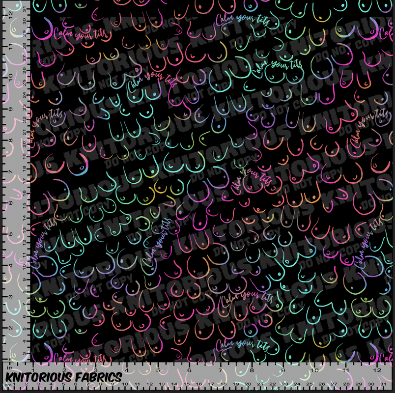 QTY of 1 = 1 yard PRE-ORDERS CAN TAKE 10-16 weeks to ship out. RETAIL CAN TAKE 14-16 BUSINESS days to ship out. For retail sometimes fabric might not be continuous. Could be 1,2,3,4, etc yard cuts. No refunds will be given until after those time frames for the length of time for delivery. It is your responsibility to check the wall and doc in the files section with updates in the Facebook group to see statuses of orders. Individual messages/emails and the like posted on the wall will not be answered continuously and you will only be referred to check yourself. To stay up to date on the status of your order please join the group for daily updates: https://www.facebook.com/groups/KNIToriousFabric/ It is recommended for best results your fabric be washed with synthrapol and color catchers. Follow washing instructions in 'terms' or in Facebook group doc under the files section or in the pinned post. Washing instructions will also be enclosed in your package on the back of the business card. Buyer negligence to not follow these instructions is not the seller's responsibility. Fabric will be printed on 58" wide fabric, but please be aware imperfections are common along the sides of the selvage when doing small/custom orders and cutting off of selvage - this can result in a final width of 54-58" useable fabric. Minor flaws such as a 1/2 inch - 2 inch difference or close to it in alignment during printing can also occur due to the nature of printing on stretch fabric, which can appear as a slight 'curve' to the printing of images on the fabric. Do not order if this will bother you. Things such as a slight heathering/grainy look can occur on lighter colors (gray, light blue, etc). Once again, do not order if this will bother you. It is also possible to have a few tiny white specks here and there where lint comes off the fabric that had the ink on it. Minor flaws like this will not be discounted or refunded. PLEASE NOTE: Different fabric types will vary in color slightly due to being printed on different fabrics. Do not expect your minky to perfectly match your cotton lycra, etc. Shades can vary in bulk with colors by 10% from what you see on the digital image/strike off. Discounts will only be given if it is greater than 10%. If it comes with a drastically different color, all members will be notified before it is shipped to them. If there are any flaws that are not considered minor, they will be disclosed before shipping to you. Please note I send any disclosures by email OR by a post on the Facebook group wall. If you do not reply within 72hrs your fabric will be shipped and I will not refund it once it is shipped, you will have to sell it in a destash or b/s/t. There is no gaurantee - and most likely different batches of fabric will match previous runs of the same print. Colors vary from batch to batch. Please also be aware when ordering no orders will be refunded or discounted if you have a single flaw on it that is smaller than/can be covered by a quarter per yard, this includes any type of flaw (including even a very small hole). If you cannot work around your flaw - do please pm me and I am more than happy to work something out with you. By ordering from this you acknowledge you have agreed to the rules in the FB group KNITorious Fabrics and still agree to them. These rules are also in the TOS you agree to upon checkout. All packages include $100 in insurance (unless international, which includes $200) through USPS.There is shipping insurance that can be purchased along with your order on this site which will cover it through USPS. If you did not ask for your total cost of your package to be insured then I will insure the rest through a 3rd party. By purchasing through KNITorious you agree the seller is not responsible for any lost, damaged, or stolen packages. If any of these occur it is the buyer's responsibility to follow the proper steps through USPS to file a claim. Anything over $100/$200 will also require a secondary insurance claim with a second party if USPS insurance was not paid for. PHOTO OF COMPLETED CLOTHING ITEMS FOR EXAMPLE ONLY