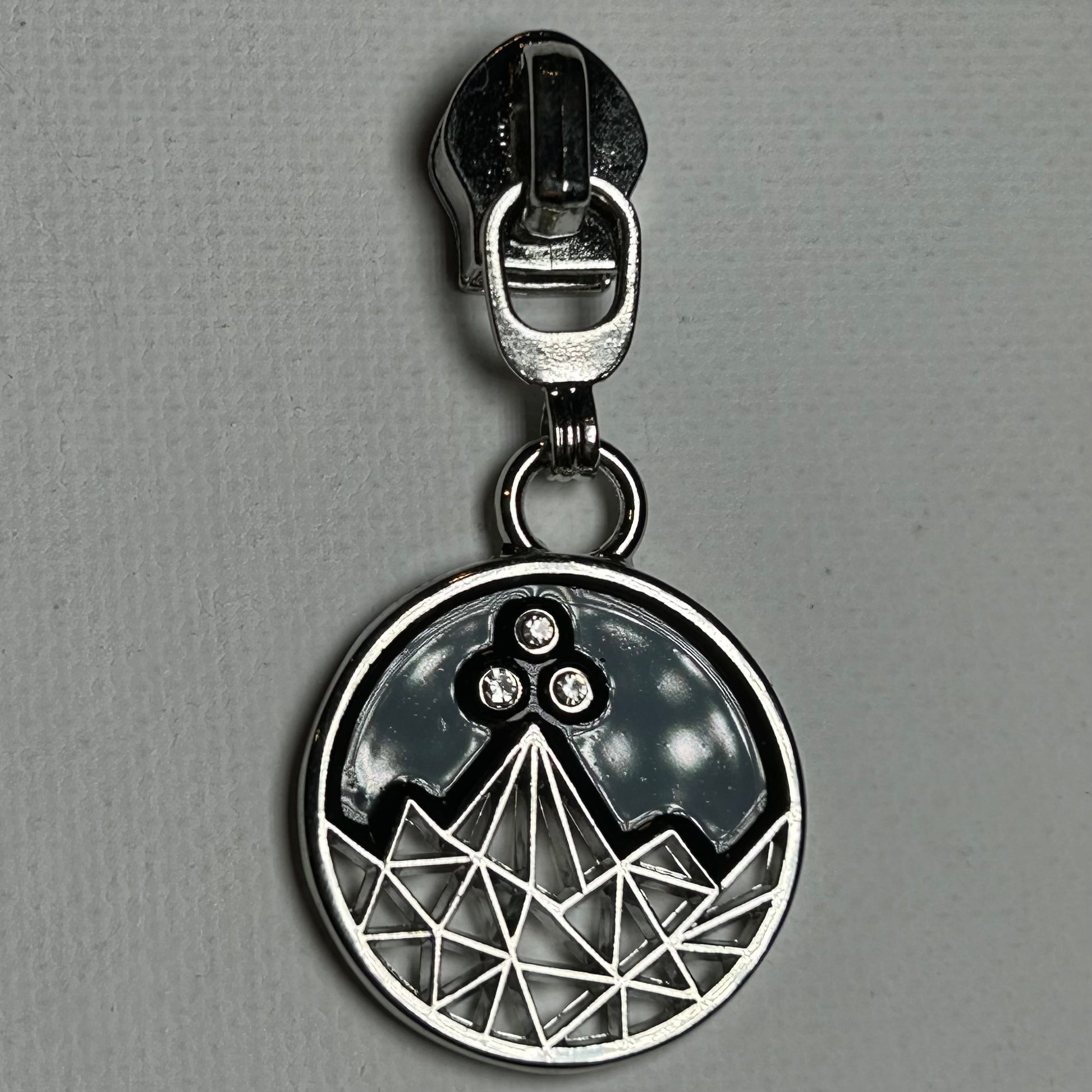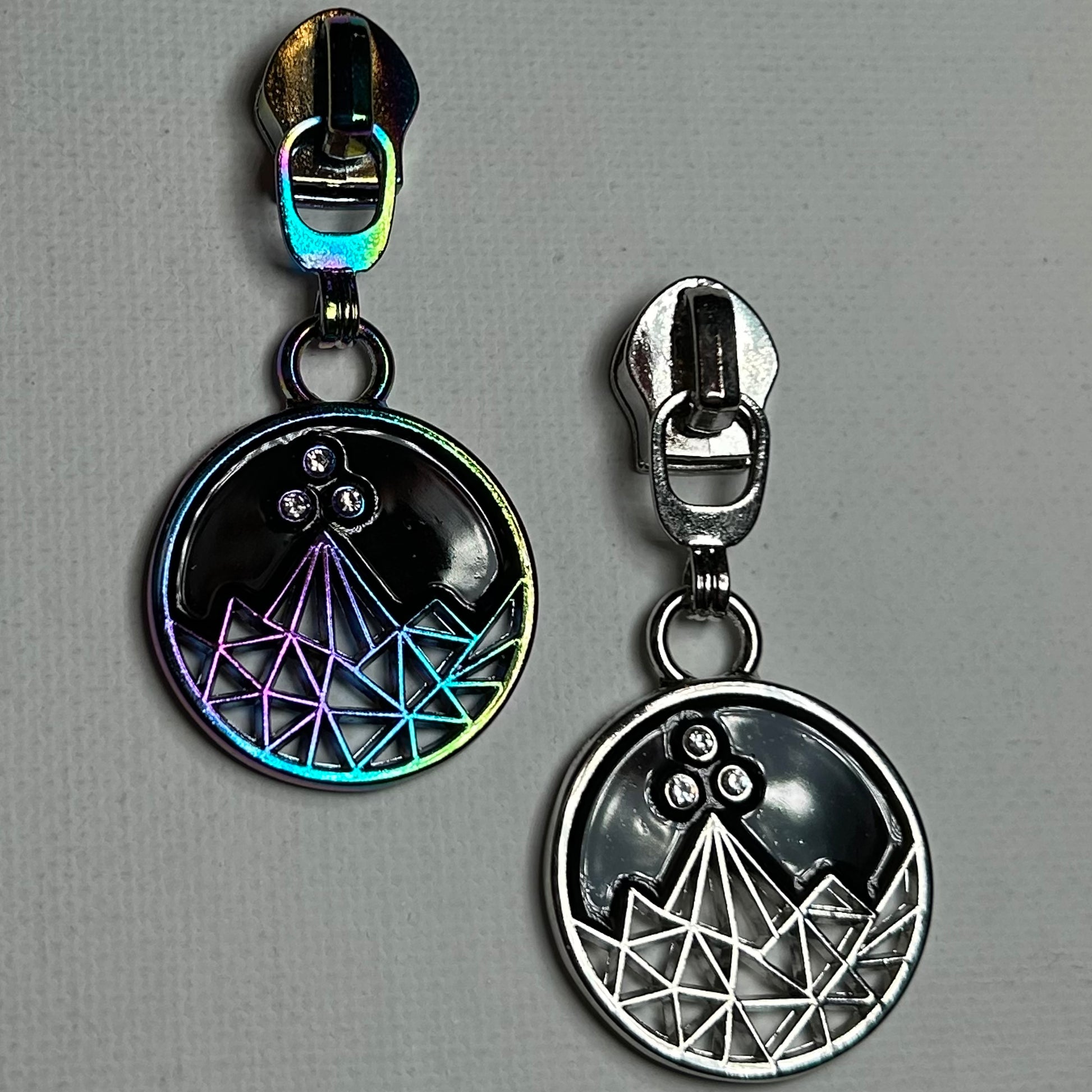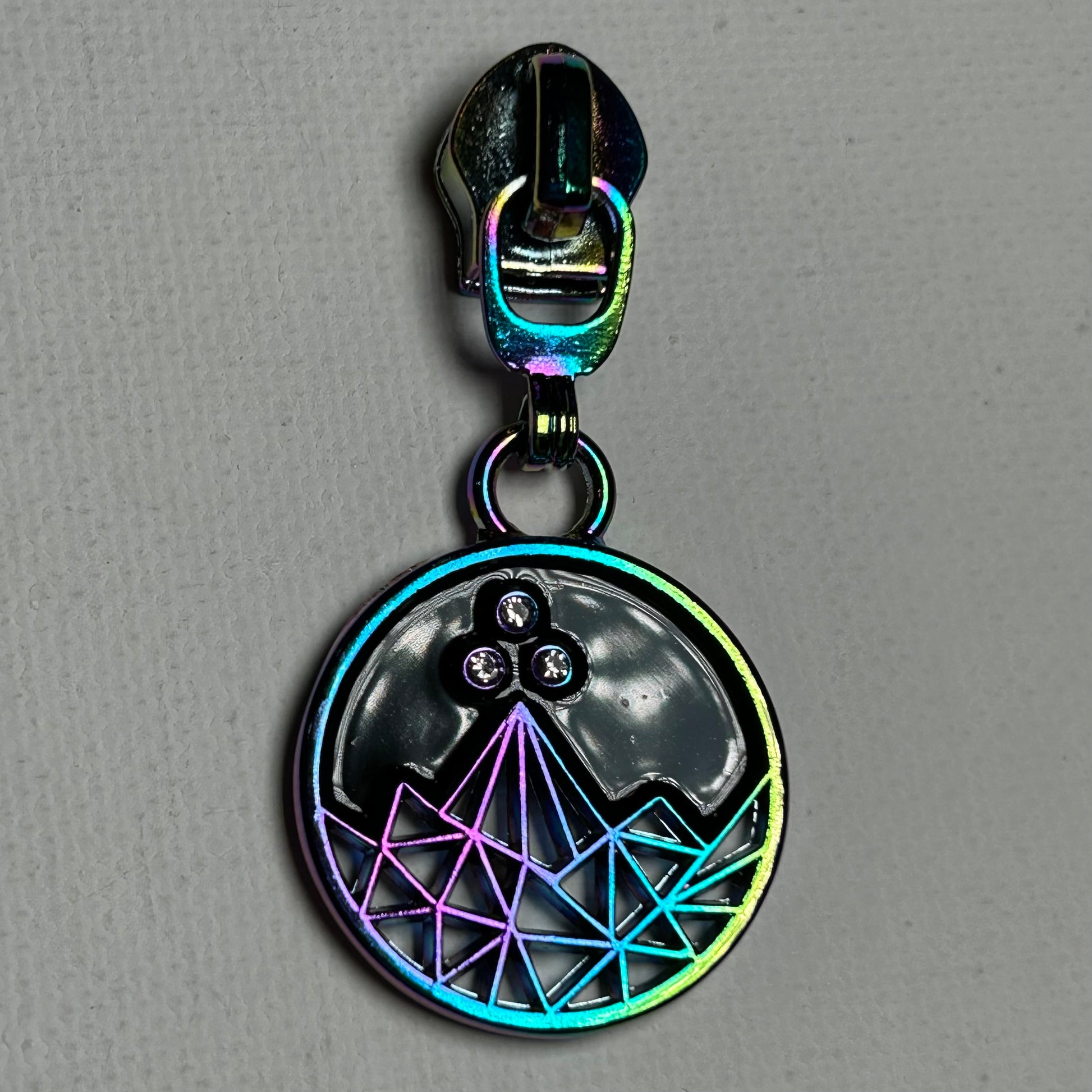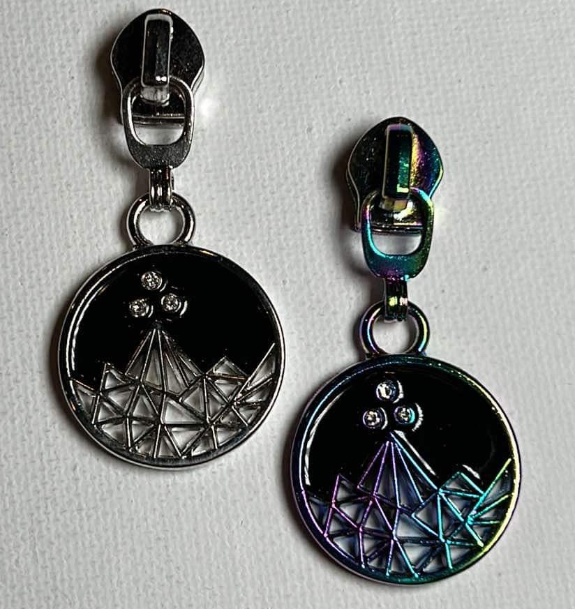 Everything with the metal mockup will be the finish chosen (silver or rainbow). The flat black area will be black enamel over that part of the metal. The 3 gems will be 3 real gemstones. The mountains are hallow in between the lines (blue is just the backdrop behind the pull)